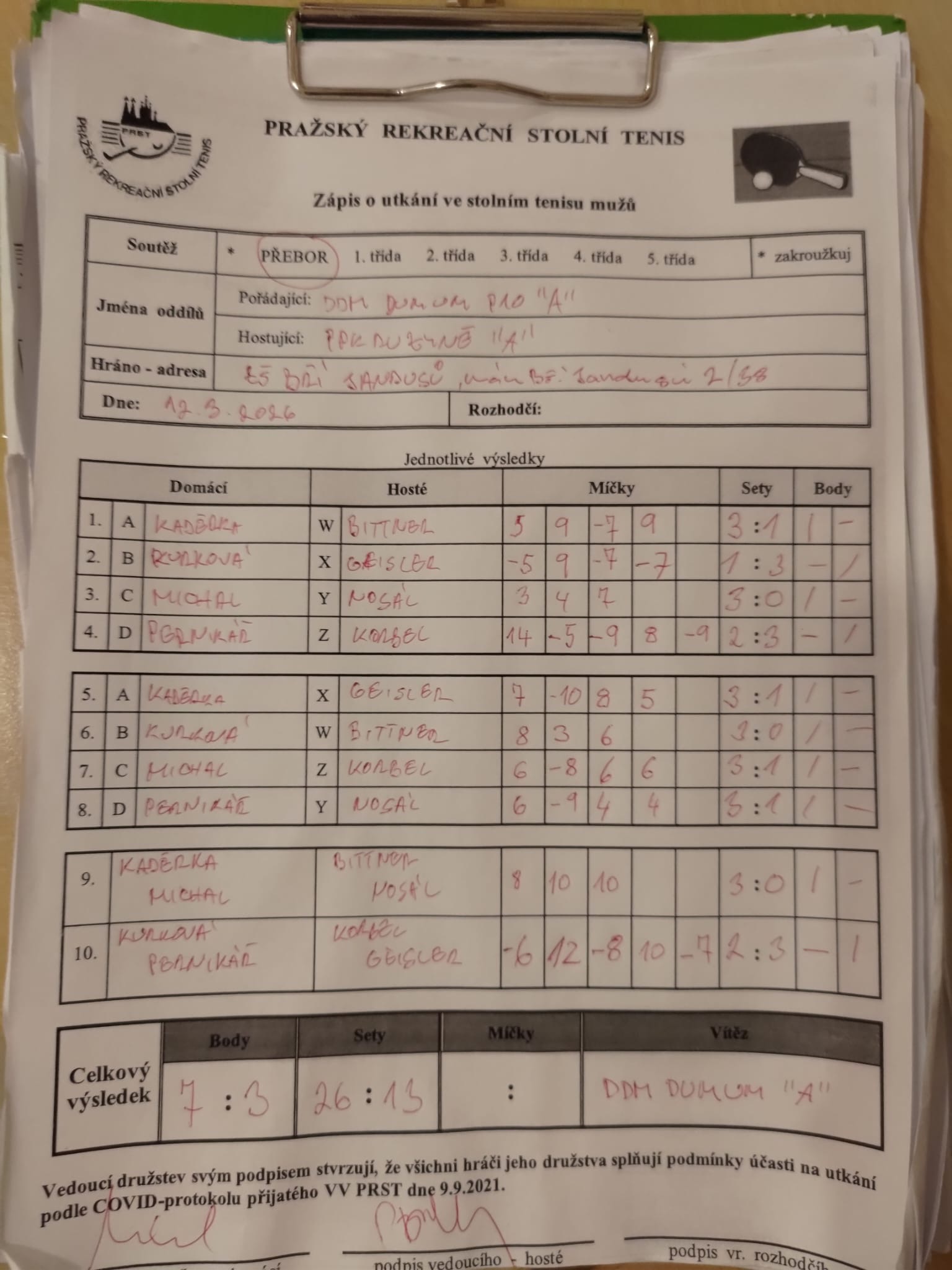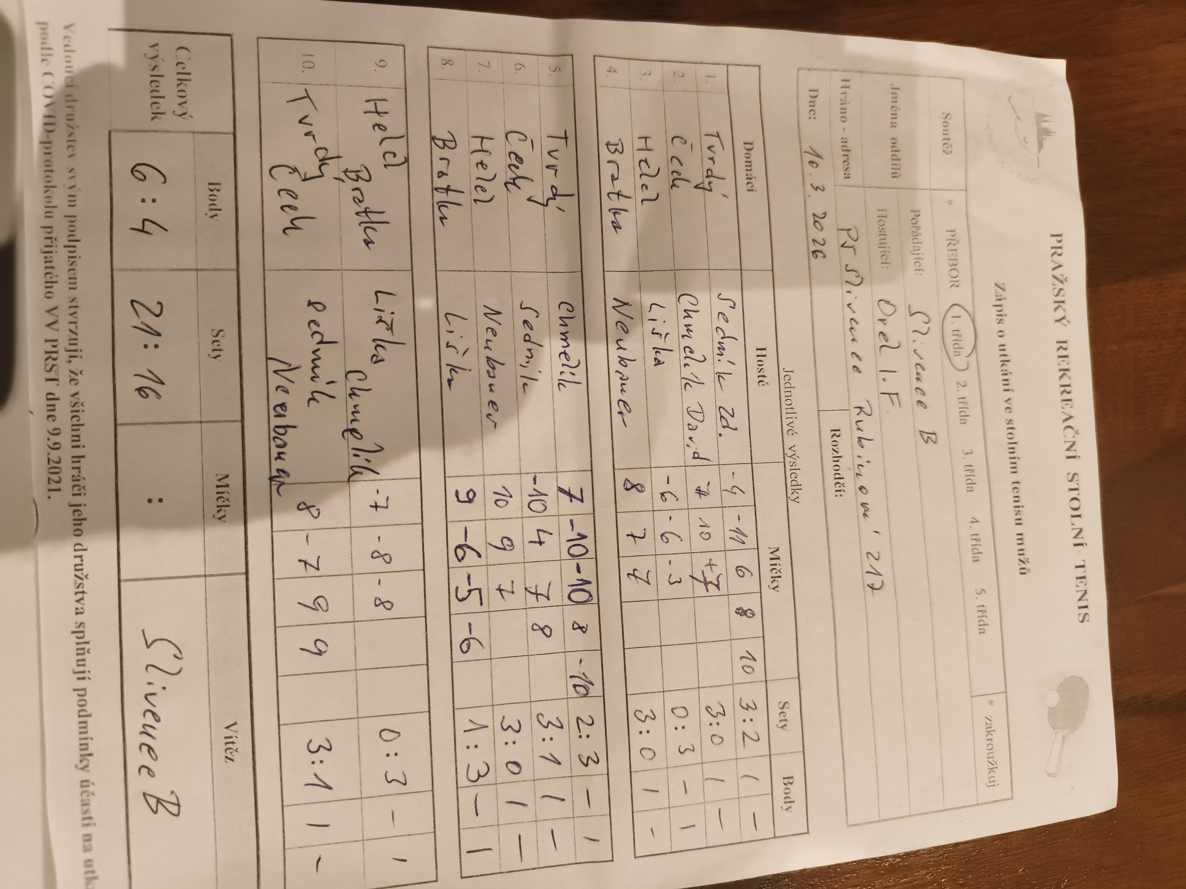 | 19 1 | Slušnej oddíl | Česká televize C | 3 : 7 | | 19 2 | Zubatý kapr B | Tulos Kobylisy | 7 : 3 | | 19 3 | Red Devils | Čakovice | 17.03.26 | | 19 4 | Malešice B | Matuna Dream A | 3 : 7 | | 19 5 | Jižní Město C | Attila B | 9 : 1 | | 19 6 | Pražské služby A | DDM Praha 10 B | 7 : 3 |