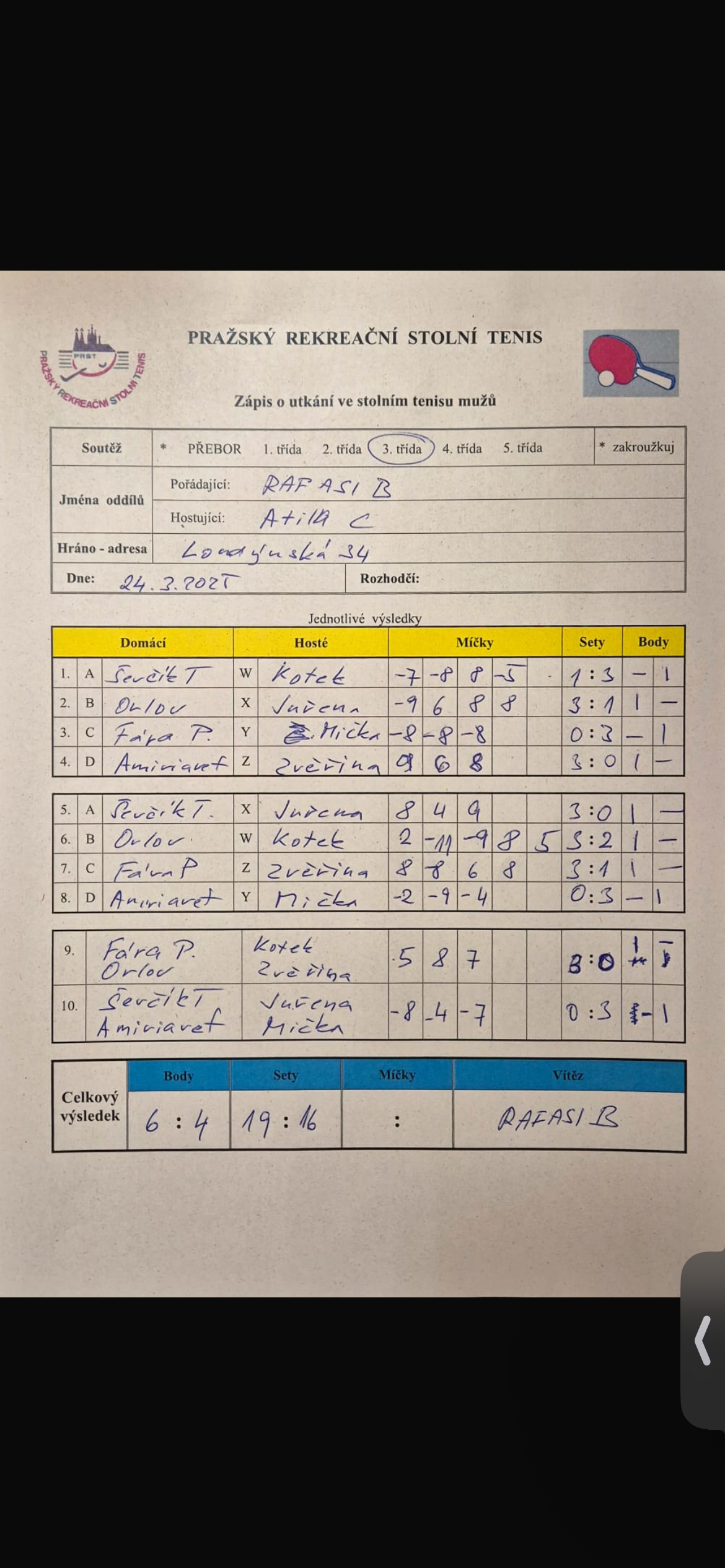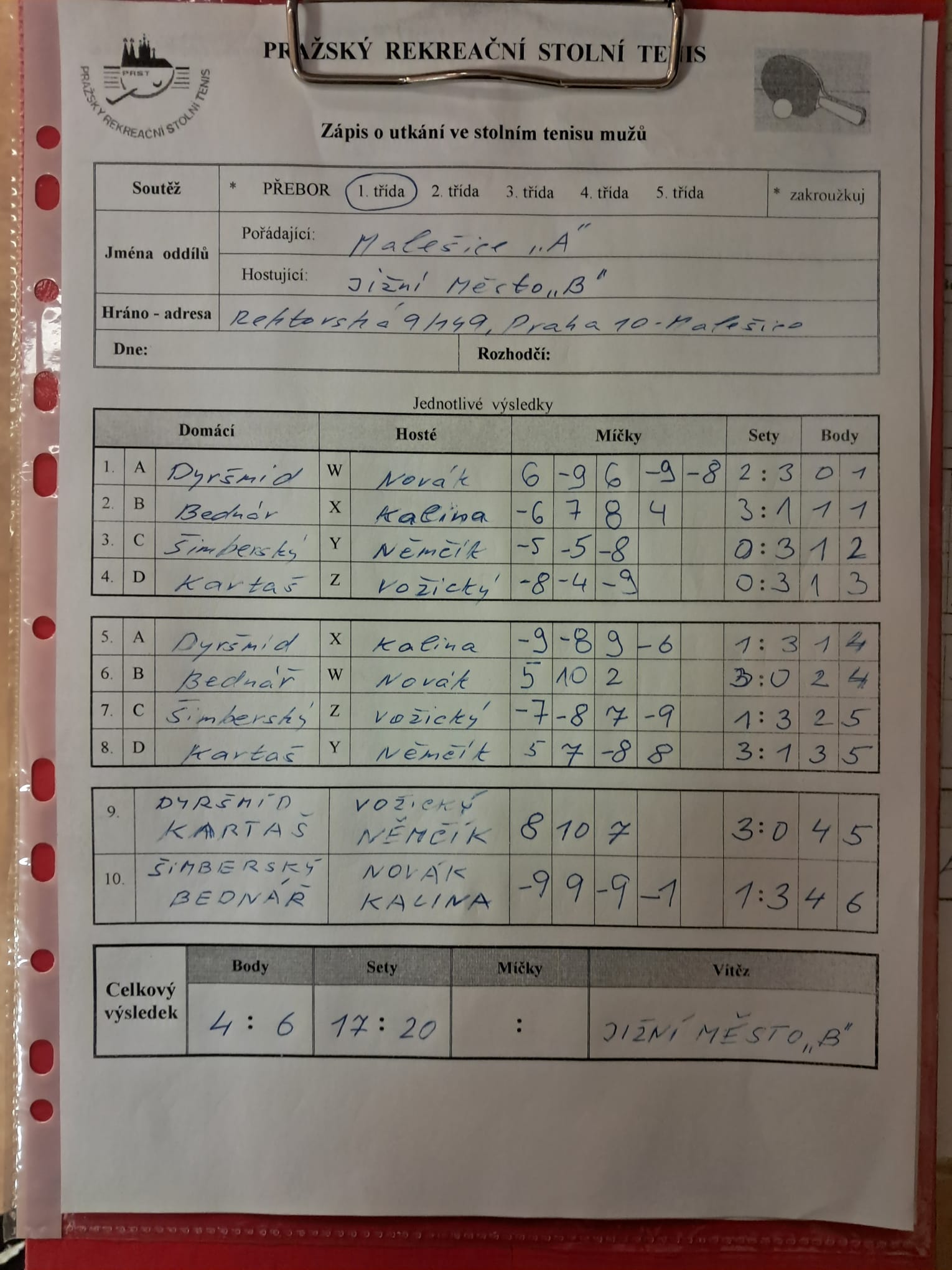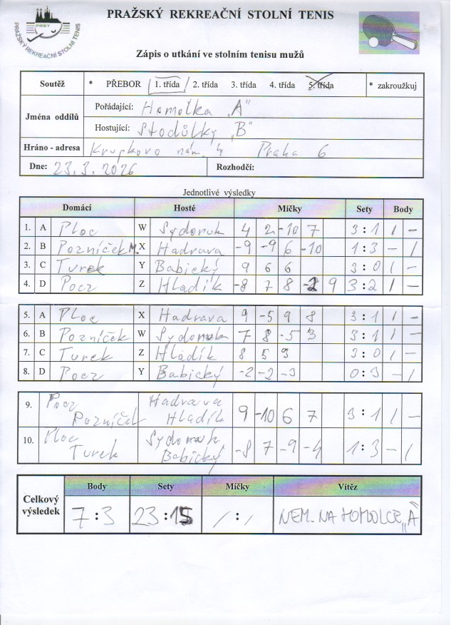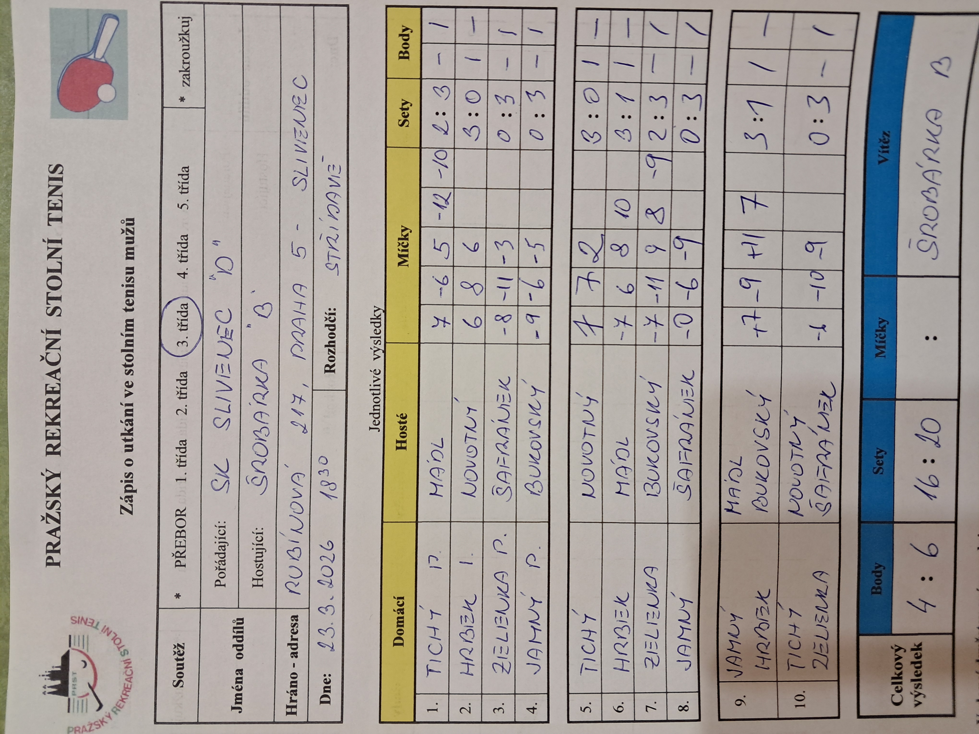 | | 20 1 | RAFASI B | Attila C | 6 : 4 | | 20 2 | Slivenec C | Matuna Dream B | 9 : 1 | | 20 3 | Zubatý kapr C | Saláti | odl. | | 20 4 | AC Souterrain | PPK Ruzyně B | odl. | | 20 5 | Ekonomický ústav | SANK Běchovice | odl. | | 20 6 | Slivenec D | Šrobárka B | 4 : 6 |