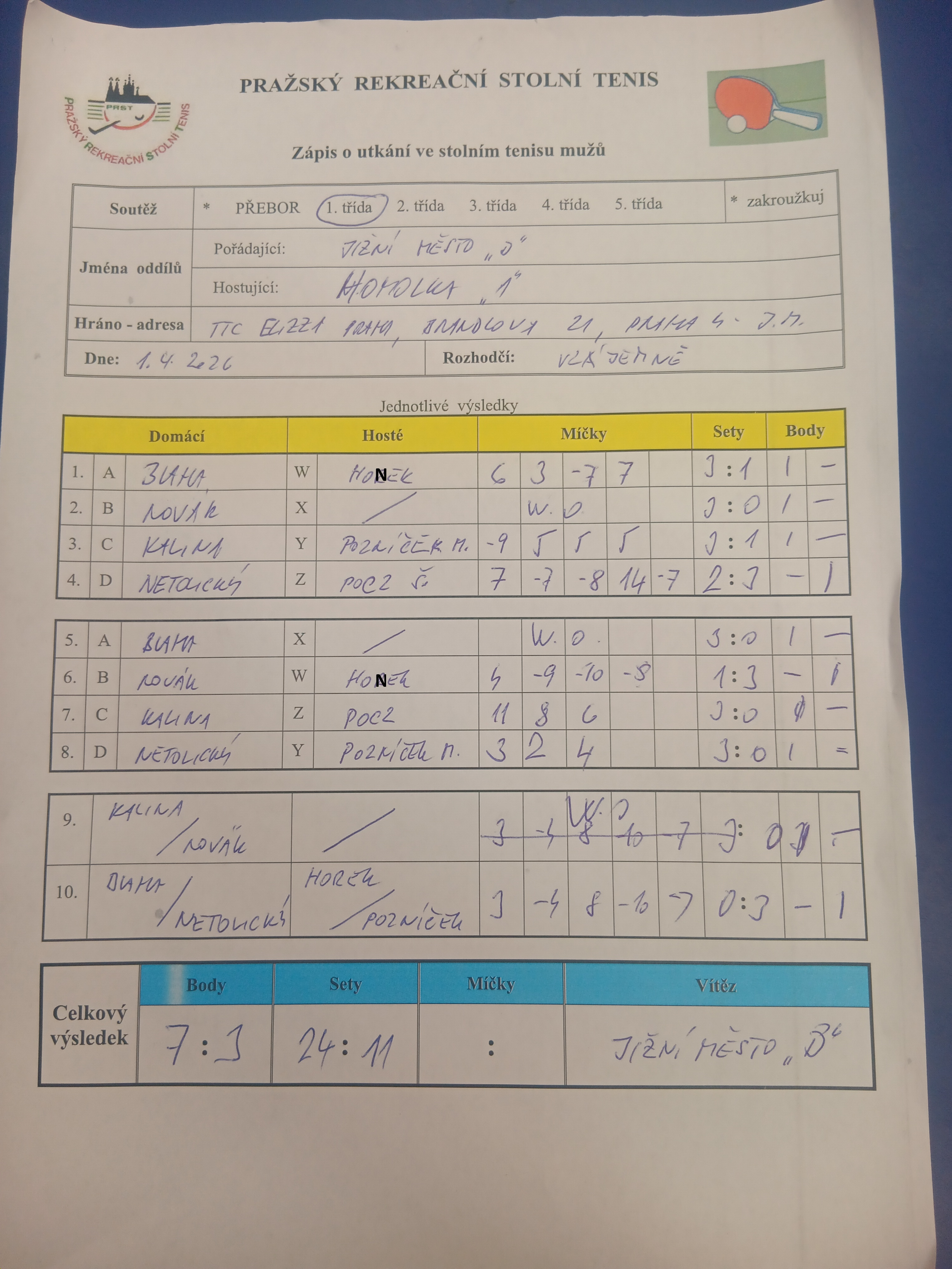 | | 21 1 | SAPA B | Orion Modřany C | 7 : 3 | | 21 2 | Orel I.F. B | Česká televize D | 4 : 6 | | 21 3 | Attila D | Torisol | 6 : 4 | | 21 4 | Slavoj Koloděje | Sokol Troja | 5 : 5 | | 21 5 | Nem. Na Homolce B | DDM Praha 10 C | 5 : 5 | | 21 6 | PPK Ruzyně C | Zubatý kapr D | 3 : 7 | | 21 7 | JLV B | SAPA A | odl. |