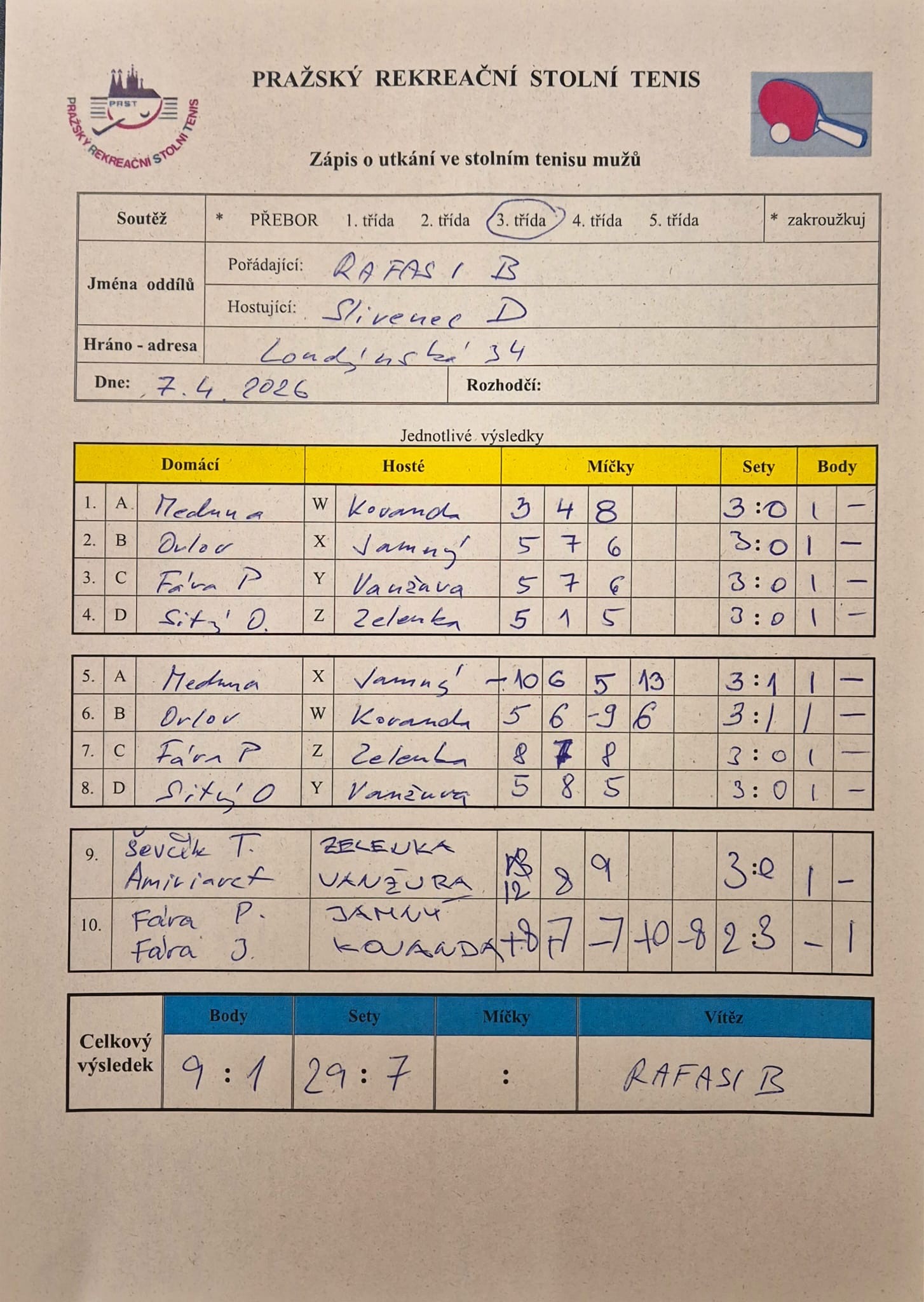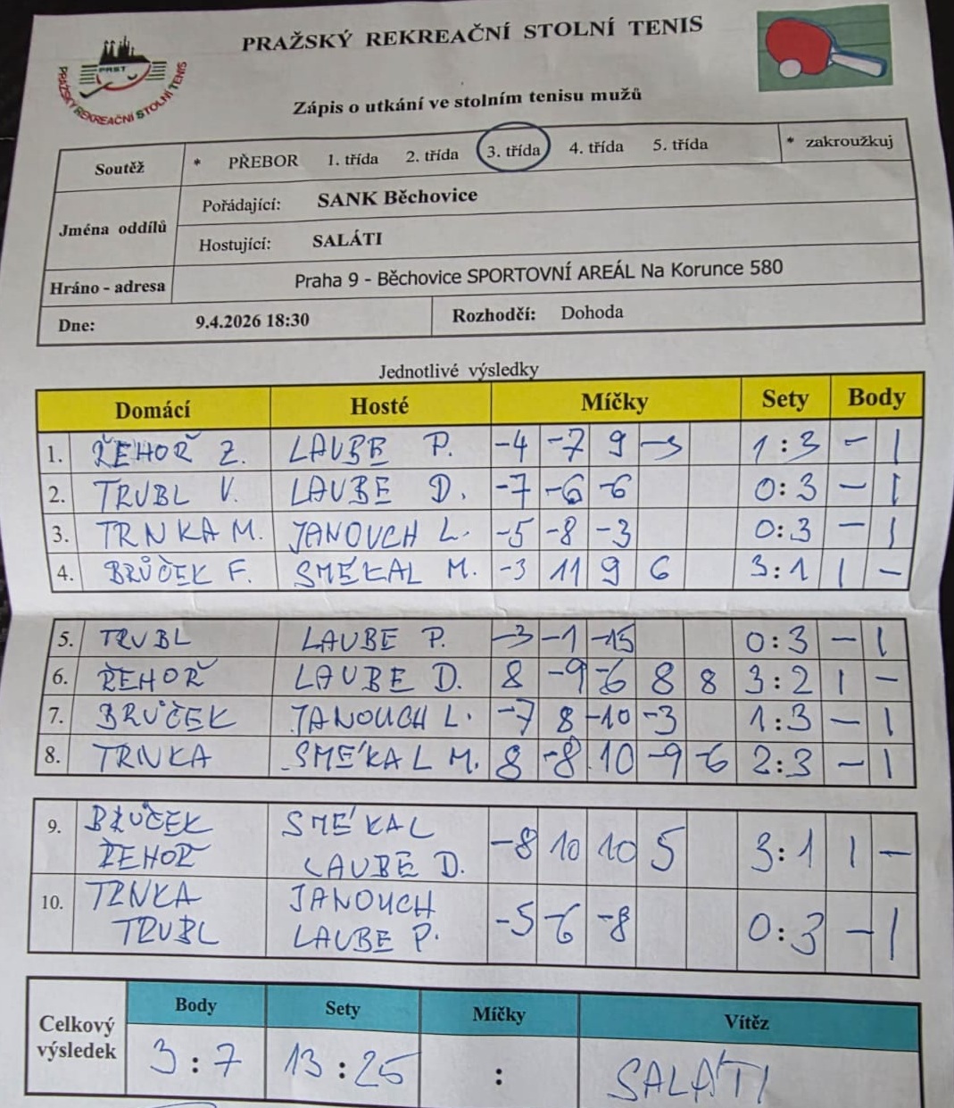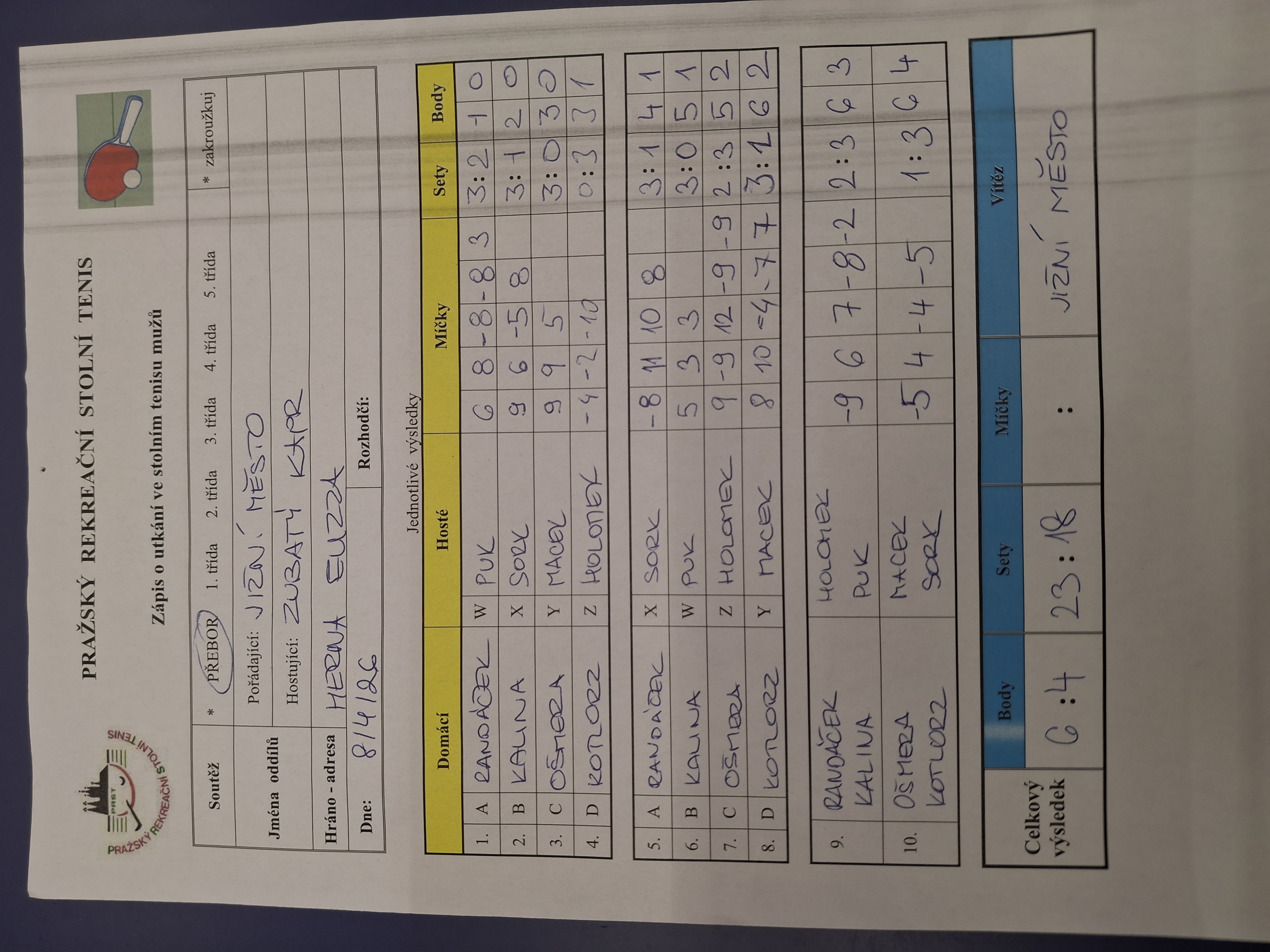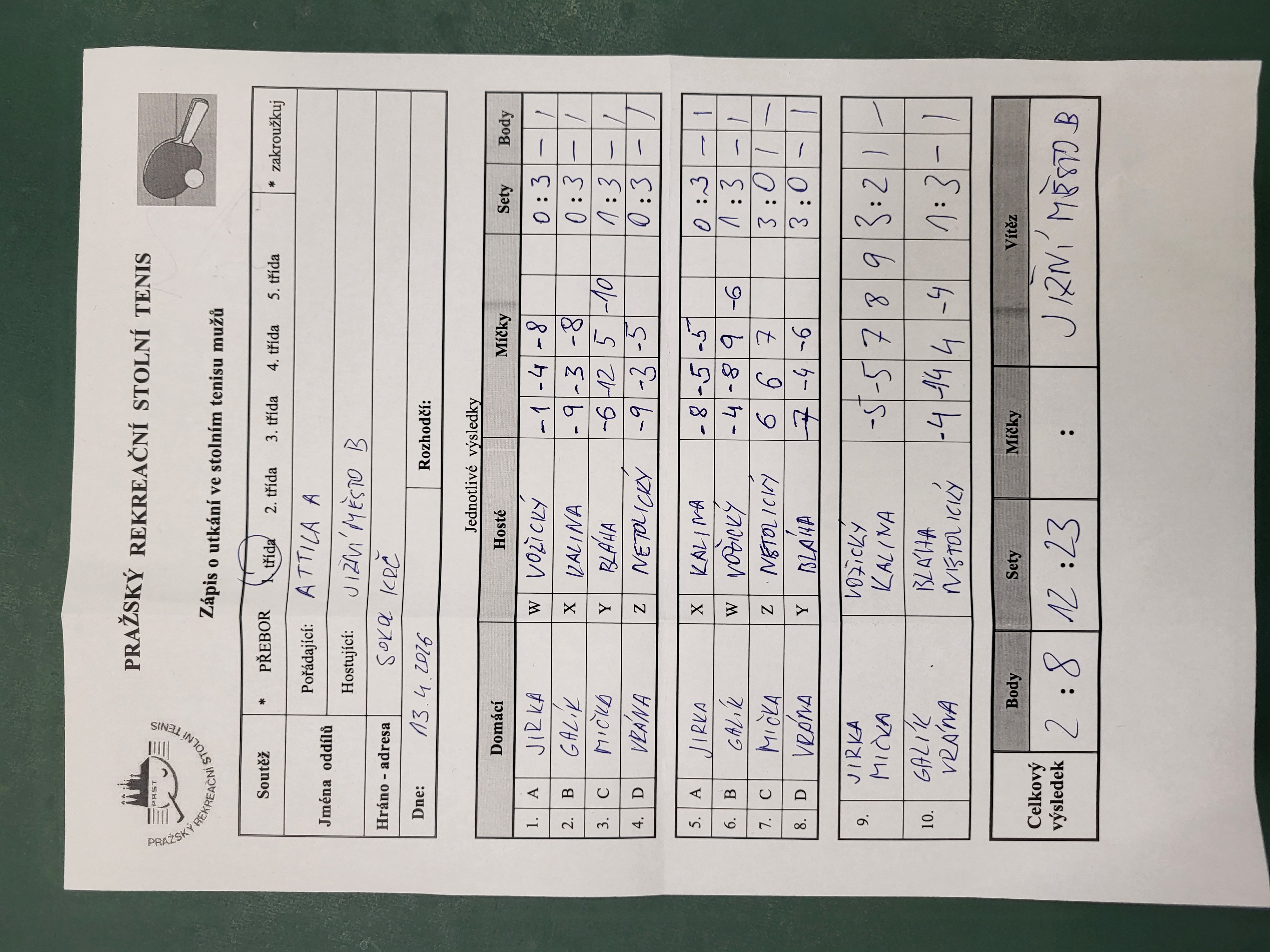 | | 22 1 | RAFASI B | Slivenec D | 9 : 1 | | 22 2 | Slivenec C | Šrobárka B | 5 : 5 | | 22 3 | Zubatý kapr C | Attila C | 9 : 1 | | 22 4 | AC Souterrain | Matuna Dream B | 3 : 7 | | 22 5 | SANK Běchovice | Saláti | 3 : 7 | | 22 6 | Ekonomický ústav | PPK Ruzyně B | 6 : 4 |