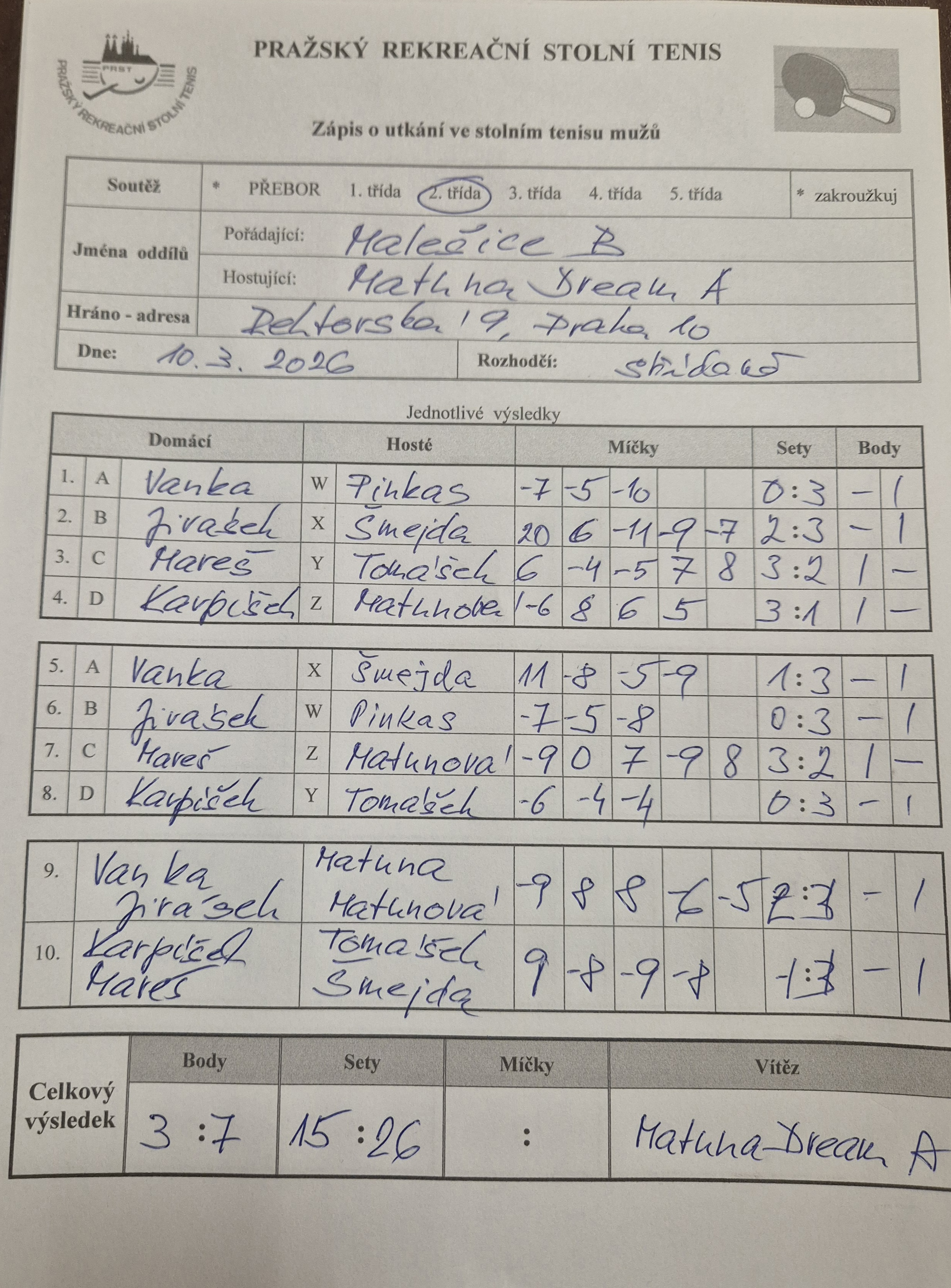 | 19 1 | Slušnej oddíl | Česká televize C | 3 : 7 | | 19 2 | Zubatý kapr B | Tulos Kobylisy | 7 : 3 | | 19 3 | Red Devils | Čakovice | odl. | | 19 4 | Malešice B | Matuna Dream A | 3 : 7 | | 19 5 | Jižní Město C | Attila B | 9 : 1 | | 19 6 | Pražské služby A | DDM Praha 10 B | 7 : 3 |