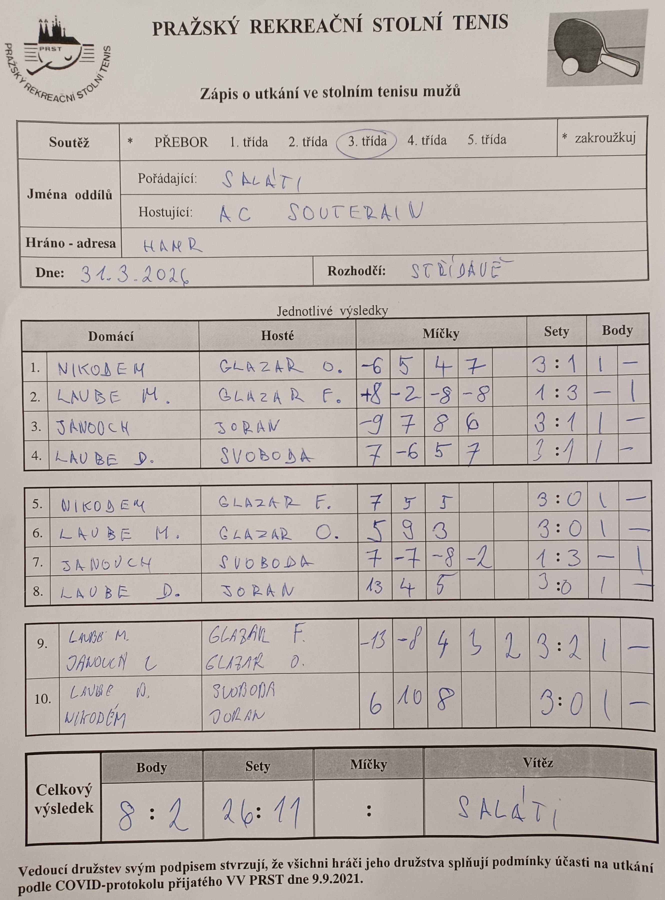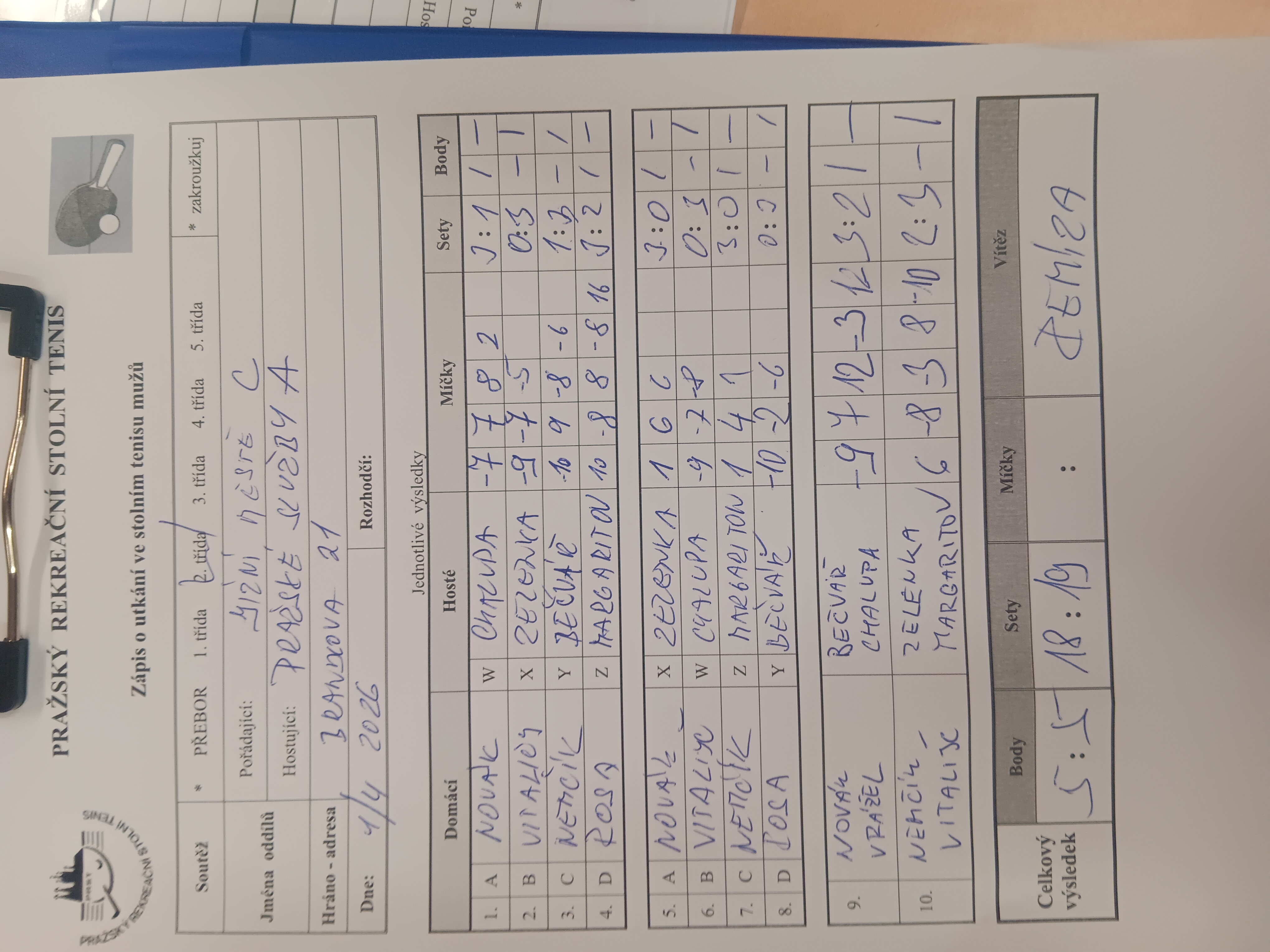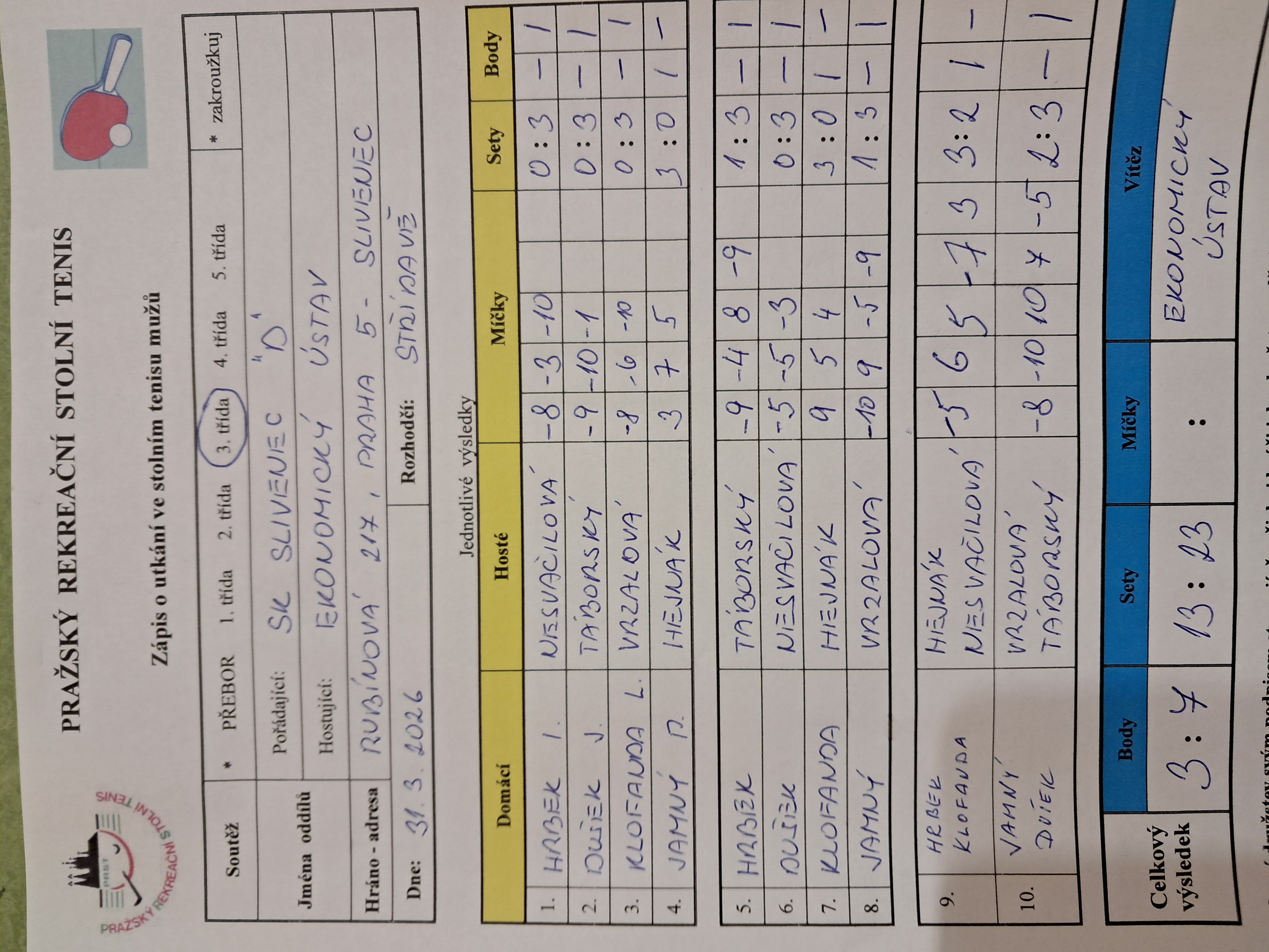 | | 21 1 | Slivenec D | Ekonomický ústav | 3 : 7 | | 21 2 | Šrobárka B | RAFASI B | 6 : 4 | | 21 3 | Attila C | Slivenec C | 1 : 9 | | 21 4 | Matuna Dream B | Zubatý kapr C | 7 : 3 | | 21 5 | Saláti | AC Souterrain | 8 : 2 | | 21 6 | PPK Ruzyně B | SANK Běchovice | 5 : 5 |