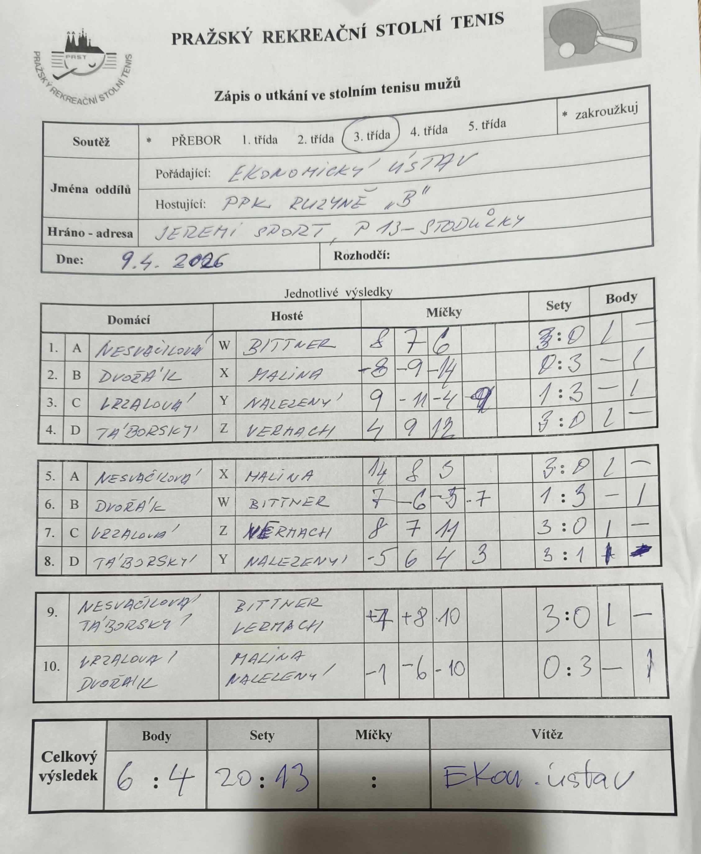 | 22 1 | Čakovice | Tulos Kobylisy | 5 : 5 | | 22 2 | Matuna Dream A | Slušnej oddíl | 7 : 3 | | 22 3 | Attila B | Zubatý kapr B | 3 : 7 | | 22 4 | DDM Praha 10 B | Red Devils | 6 : 4 | | 22 5 | Pražské služby A | Malešice B | 14.04.26 | | 22 6 | Česká televize C | Jižní Město C | 5 : 5 |