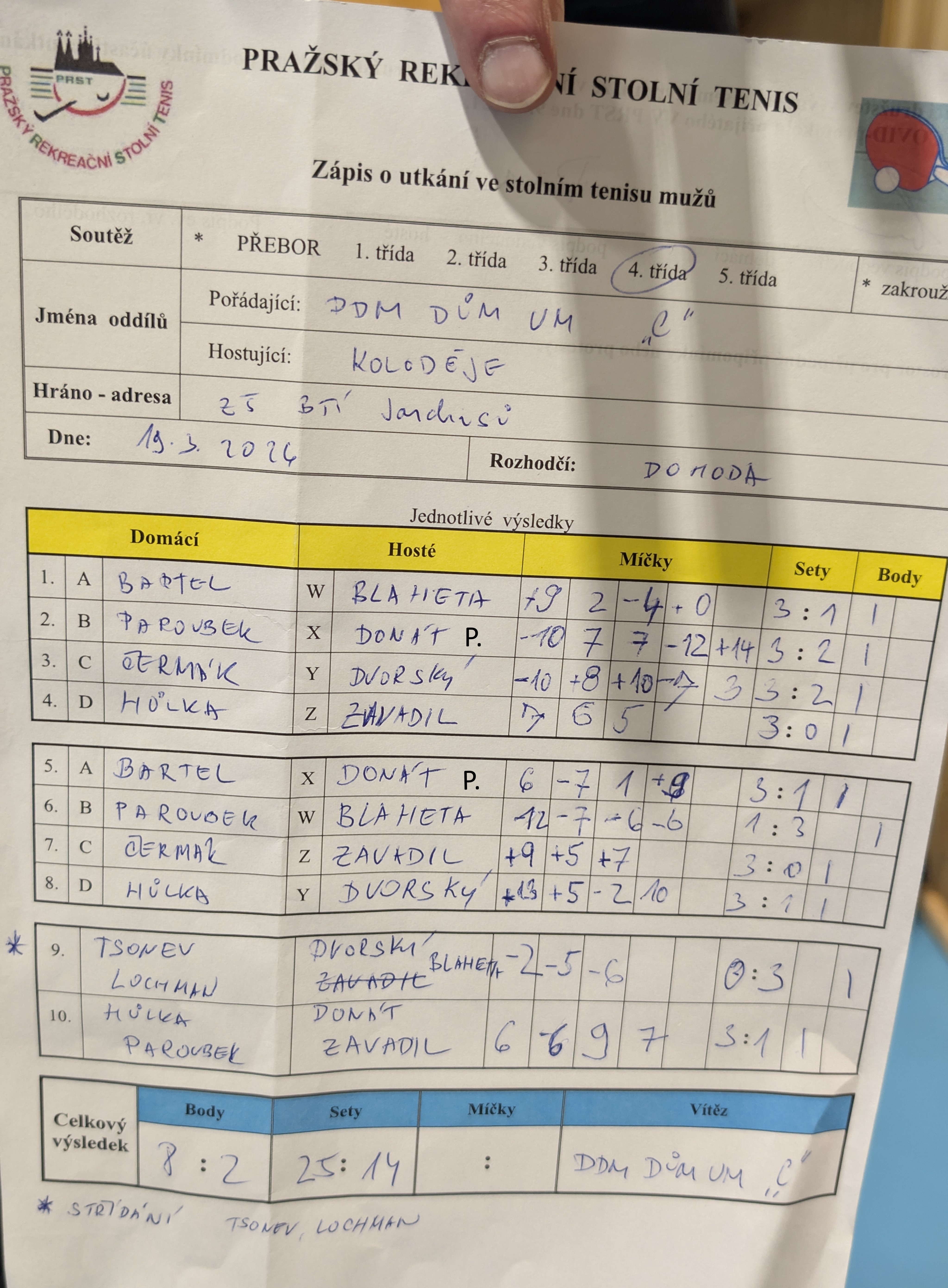 | | 22 1 | Orion Modřany C | JLV B | 10 : 0 | | 22 2 | SAPA A | PPK Ruzyně C | 10 : 0 | | 22 3 | Zubatý kapr D | Nem. Na Homolce B | 5 : 5 | | 22 4 | DDM Praha 10 C | Slavoj Koloděje | 8 : 2 | | 22 5 | Sokol Troja | Attila D | 9 : 1 | | 22 6 | Torisol | Orel I.F. B | 2 : 8 | | 22 7 | Česká televize D | SAPA B | 5 : 5 |